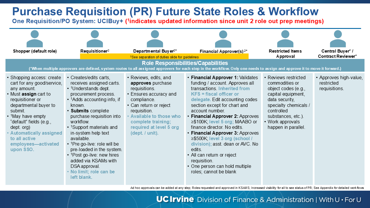 Explore updated role assignments and workflow to see how purchase requisitions flow through the UCIBuy+ system.